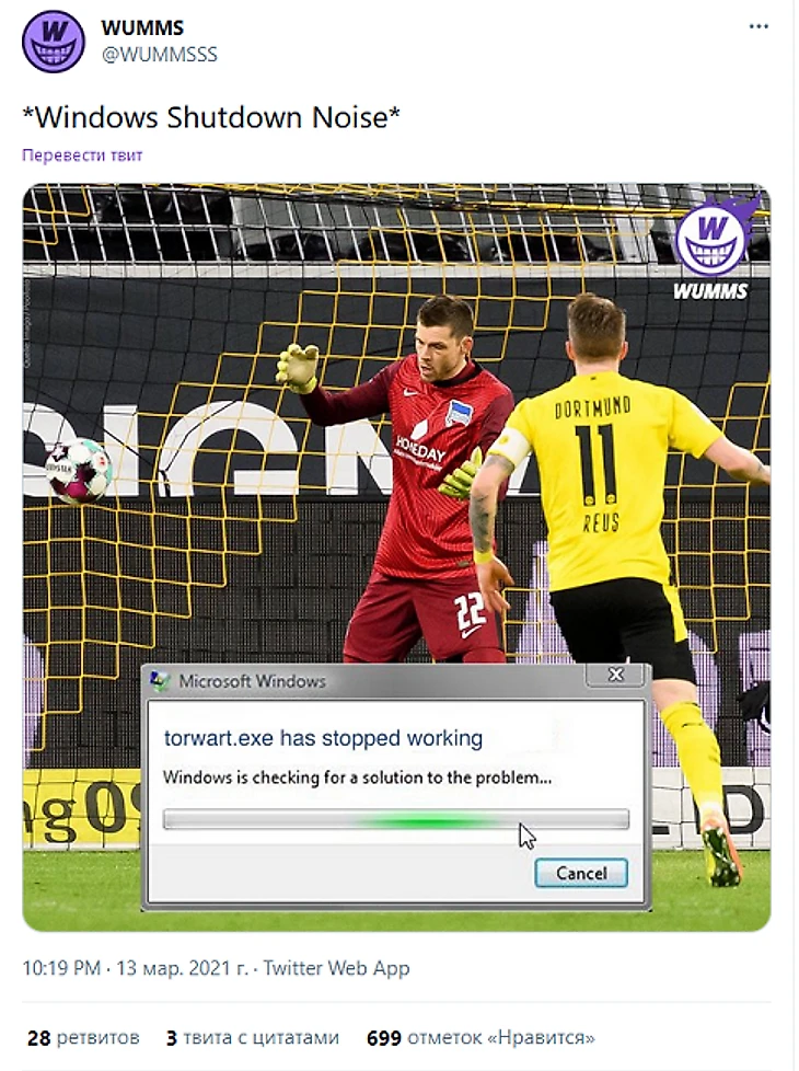 Звук сбоя Windows. На картинке: вратарь.exe перестал работать. Windows ищет решение этой проблемы...
