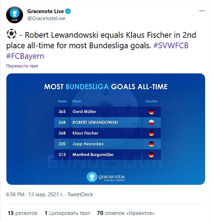 Роберт Левандовски сравнялся по голам с Клаусом Фишером и вышел на второе место в списке лучших бомбардиров Бундеслиги за всё время.