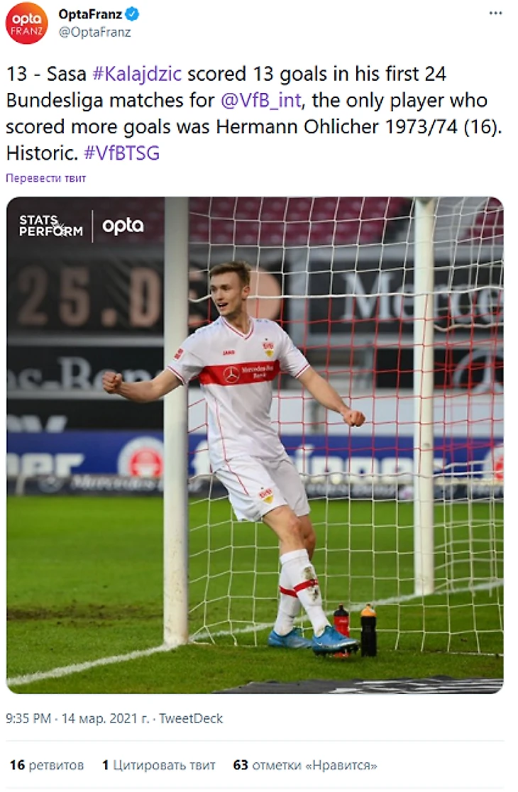 13 - Саша Калайджич забил 13 голов в своих 24 матчах за «Штутгарт». Только Германн Оличер в сезоне 1973/74 забил больше - 16. История.