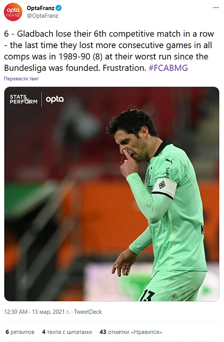 6 - Гладбах проигрывает свой шестой матч подряд - последний раз, когда они проигрывали так много игр подряд был в 1989/90 - восемь - в их худшей серии с момента основания Бундеслиги