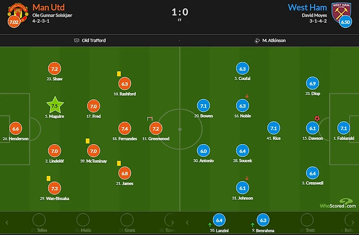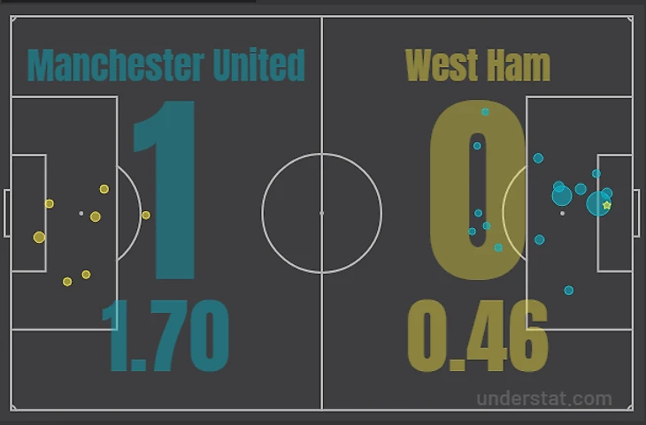 Глядя на xG становится более менее понятно, как все проходило. МЮ, помимо гола Доусона в свои ворота, наиграл на один точно. К тому же, Гринвуд 2 раза во втором тайме ударил в штангу. У Вест Хэма было 7 шансов, самый серьезный из которых — это удар Соучека мимо ворот, который, кстати, 0.13 гола.
