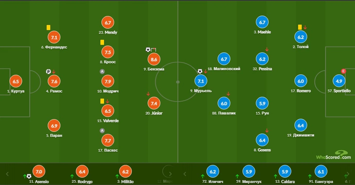 12. Первый тайм подвёл определенные итоги. Первое: Зидан угадал со схемой, 3 центральных защитника сдерживали атаки соперника, опасных моментов, помимо шанса Госенса не возникало; по началу «Реал» не мог качественно выходить из-под прессинга «Аталанты», однако, низкая позиция Модрича помогла команде искать варианты продвижения атак. Центра поля итальянцев провалил игру: это касается и Пашалича, и Пессины, и Де Рона. Особенно это касается одного из лидеров команды – Мартена Де Рона. 0 отборов за весь матч – нонсенс для опорника его класса.