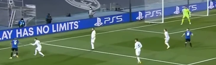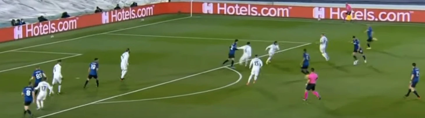 20. «Аталанта» всё-таки смогла забить, благодаря очень интересной заготовке, связанной со штрафным ударом. Стенка «бергамасков», расположившаяся перед стенкой «Реала» разбежалась, отчасти дезориентировав Куртуа. У Муриэля выдался отличный удар в «девятку». Однако, уже в следующей после розыгрыша мяча атаке, оборона «Аталанты» снова провалилась, Мехле потерял позицию, с его фланга пошла подача, с которой в ближний угол ворот пробил Марко Асенсио, отклеившийся от Джимшити. 3:1, «Реал» идёт дальше.