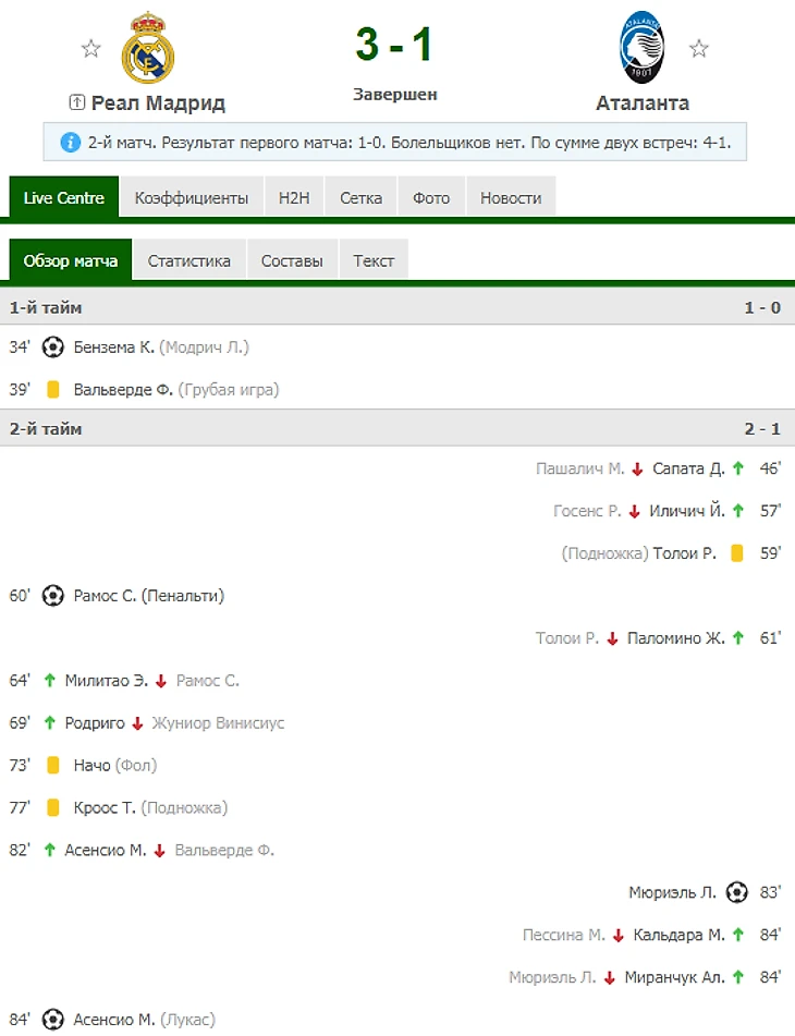 Второй поединок мог стать реваншем, ведь Аталанта достаточно забивная команда, в серии А больше них смог забить только Интер который идет на первой строчке чемпионата, а у Сливочных как раз из-за травмы отсутствовали во втором поединке двое защитников, Карвахаль и Одриосола. Не смотря на то что Реал в первой игре показал себя лучше и победил, букмекеры оценили шанс на их победу в этом поединке, скромным коэффициентом 2.25 а победу гостей 3.00 и ничью 3.6. Исходя из этих данных мы можем точно сказать, что эксперты не видели в этой игре явного фаворита, а это означало что игра может набрать непредсказуемые обороты, и от этого будет только интересней.