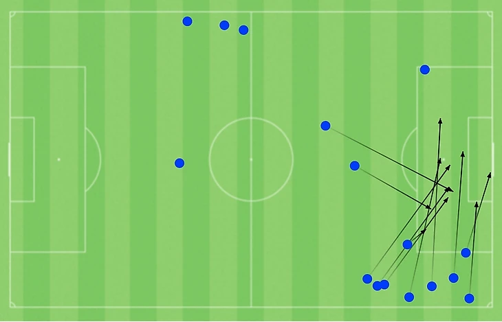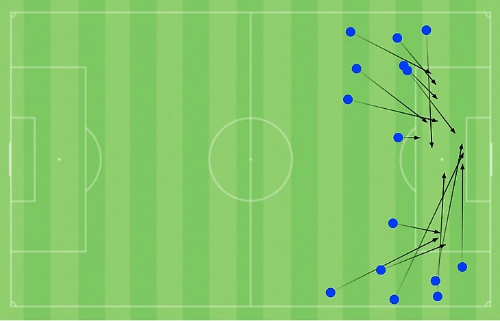 Карта передач «Зенита» в штрафную после удаления Ахметова.