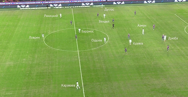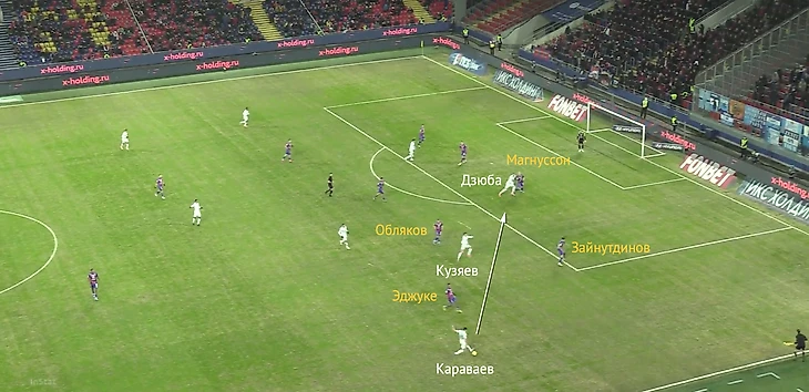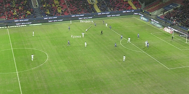 Гол Дзюбы – вообще лучший пример свободы Кузяева (а также Вендела) и реакции ЦСКА на нее. В начале голевой атаки Далер наконец-то получил мяч в широкой позиции – в этот момент за него отвечал Эджуке.