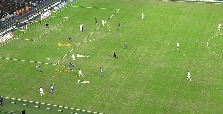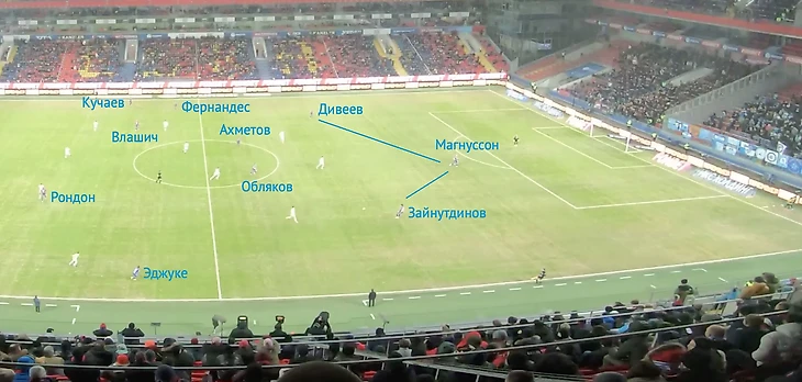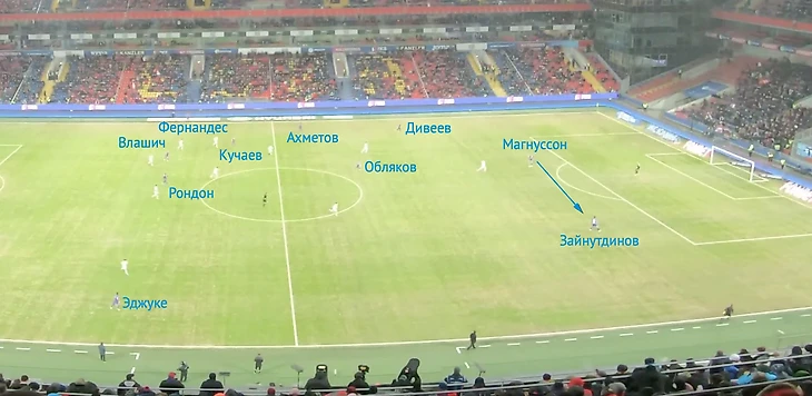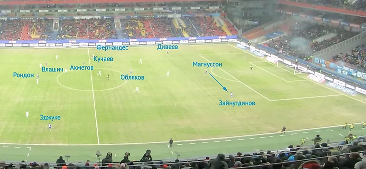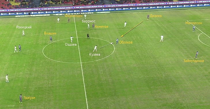 В начале голевой атаки ЦСКА мяч был у Марио Фернандеса, который отпасовал назад Дивееву и занял высокую позицию – Зайнутдинов в этот момент располагался на месте левого центрального защитника.