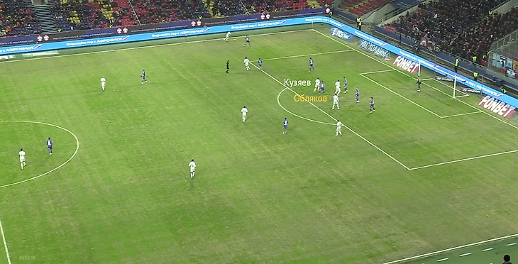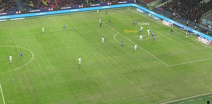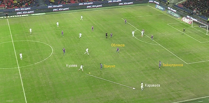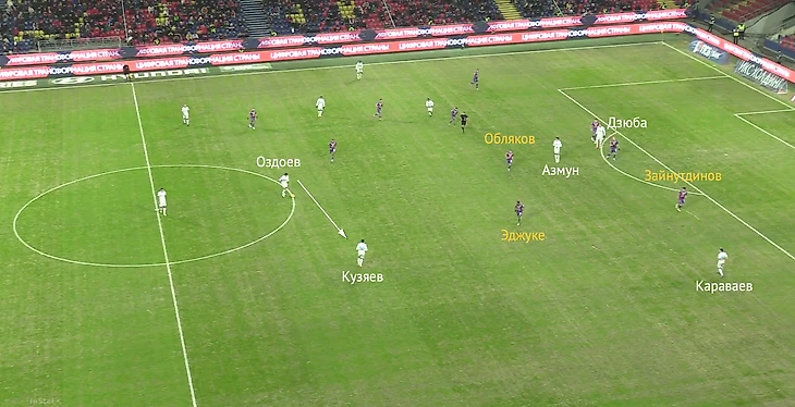 Обляков, Эджуке и Зайнутдинов не справились с движением Кузяева – Далер получал слишком много свободы. Вот, например, эпизод на 28-й минуте – все началось с ухода Кузяева в глубину и получения передачи от Оздоева.