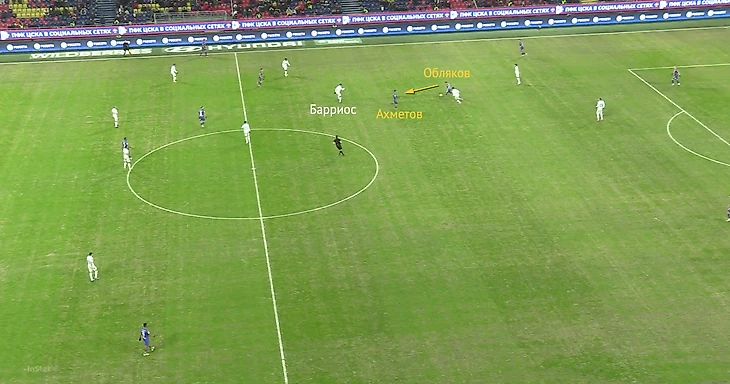 Обляков на вираже обогнал Кузяева, а дальше Барриос отпустил Ахметова, тоже не поджав соперника. Ахметов быстро развернул атаку ЦСКА влево – Барриос и Кузяев оказались отыгранными от эпизода.