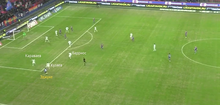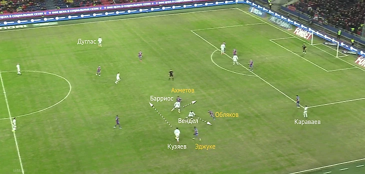 Дальше Кузяеву помогли Барриос и Вендел – смещением в правый полуфланг и дальнейшим движением вперед они увели Облякова и Ахметова. Эджуке так и не вступил в отбор, поэтому Кузяев спокойно продвинулся в середину и отдал пас Ракицкому.