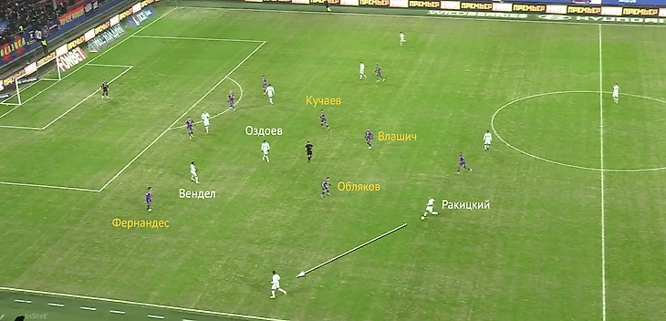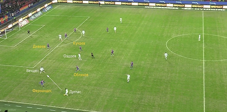 Давление «Зенита» на чужой половине оказалось нестандартным – Оздоев не поднялся к Облякову, а остался в центре поля (за его спиной оказался Влашич, к которому мог подняться Ракицкий). Из-за этого в момент передачи Дивеева на Облякова в середину выдернулся Кузяев.