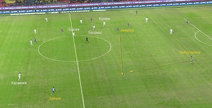 Эта задумка точно была направлена на лучший контроль мяча – кажется, было две причины для такой роли Зайнутдинова. Во-первых, она могла разрушить прессинг «Зенита» – при глубокой позиции Бахтиера за ним, например, мог выдвинуться Оздоев, а не Кузяев (как происходило, когда Зайнутдинов исполнял классического левого защитника). Во-вторых, так Эджуке получал пространство при игре один-в-один с Караваевым.