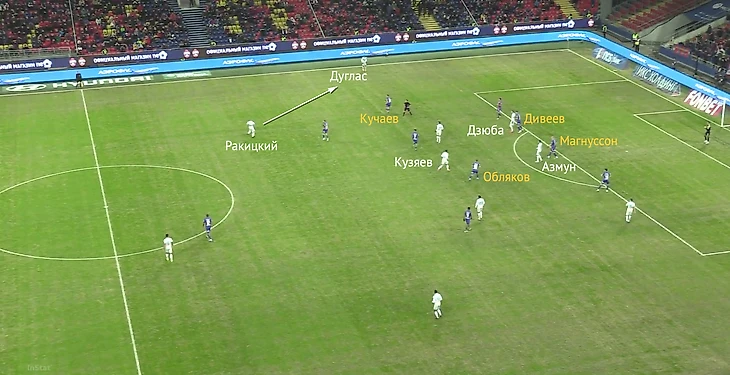 Дуглас готовит подачу – Кузяев уже в штрафной, но Обляков еще играет с ним.