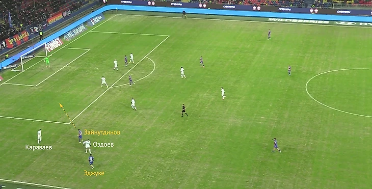 Зайнутдинов классно сработал в финальной трети – отдав мяч Эджуке, Бахтиер не остановишься, а продолжил движение в штрафную по диагонали, забрав с собой Караваева.
