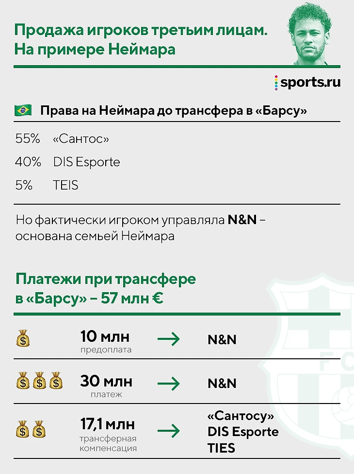 Владение игроков третьими лицами (TPO – Third-party ownership) пользовалось популярностью в Бразилии и Аргентине – вы наверняка помните, как при трансфере Неймара в «Барселону» «Сантос» получил что-то в районе 50 миллионов евро, хотя весь трансфер обошелся «Барсе» в 88 млн, а остальные деньги достались фондам: семейному и стороннему.