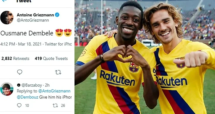 Усман Дембеле был вызван в сборную Франции впервые за два года, и Антуан Гризманн отреагировал на эту новость в Twitter.