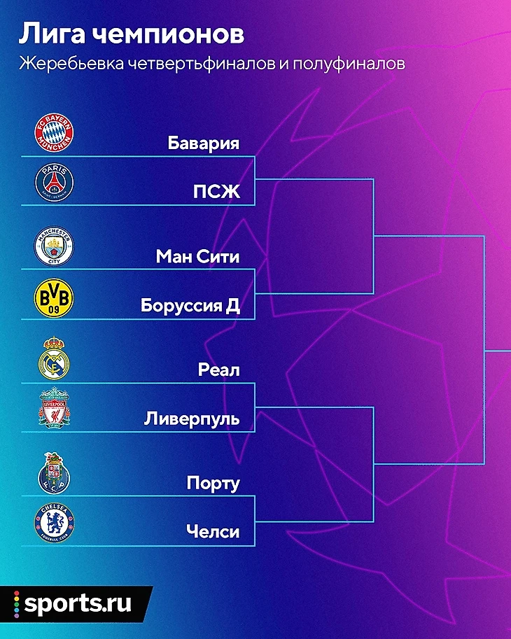 • Полуфинал верхней половины таблицы – максимально интригует. Там может случиться и противостояние бывшей и нынешней команд Пепа («Ман Сити» против «Баварии»), и нефтяное дерби («Ман Сити» против «ПСЖ»), и повторение немецкого финала ЛЧ-2012/13 («Бавария» против «Боруссии»).