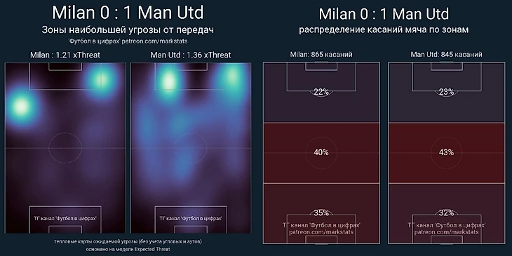 Вообще в том же пункте я заговорил о схожести и различиях между командами, а в этом продолжу. Вот так выглядят карты владения и угроз воротам со стороны команд.