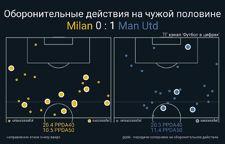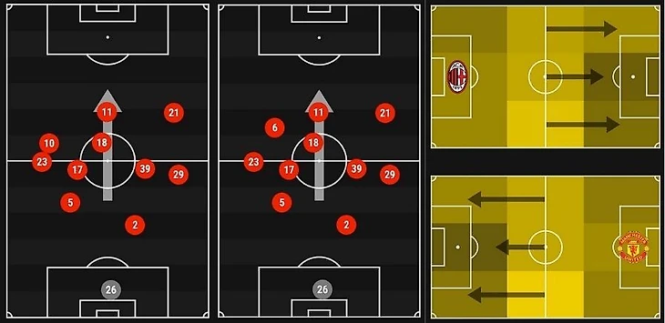 Различия начинались на половине поля соперника. Думаю, всем бросилось в глаза насколько неуклюже в первом тайме смотрелись Фред и Скотти по сравнению с Кессье и Мейте. Опорники Милана больше задействованы в перепасовках со своими товарищами по атаке, но при этом менее устойчивы под прессингом. Пожалуй, что в рамках своих формаций команды находятся на разных стадиях развития с учетом вполне схожих прошлых проблем. Милан сделал акцент с начала сезона на активном прессинге и владении, а Юнайтед на плотной обороне и быстрых атаках.