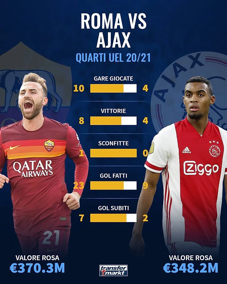 - Единственная встреча голландского и итальянского клуба состоялась на групповой стадии Лиги чемпионов 2002/03. «Аякс» тогда добился домашней победы 2:1, а встреча на римском «Олимпико» завершилась вничью — 1:1. В тех матчах забивали Ибрагимович, Литманен, Кассано и Батистута.