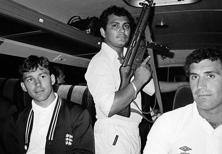 25 мая 1986 г. Мексика. Вооруженная охрана сопровождает автобус только что прилетевшей сборной Англии из аэропорта Монтеррея в отель "Camino Real" в Сальтильо. На фото капитан англичан Брайан Робсон и голкипер Питер Шилтон.
