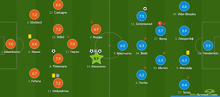 Вот оценки игроков за матч, и хотя с некоторыми из них я не согласен, например с оценкой Теллеса и Погба, то с оценкой Фреда согласен полностью. Конечно у любого бывают кошмарные матчи, ведь до этого Фред был надёжен, ему не хватало Мактоминея. Матич абсолютно не попал в игру. Против агрессивного прессинга Лестера он ничего не смог противопоставить, впрочем как и все остальные. Но об этом попозже.