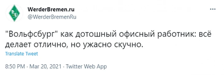 Счет был открыт уже на девятой минуте, когда нападающий хозяев Саргент ошибся в штрафной и просто срезал мяч в собственные ворота. На 42-й минуте «Вольфсбург» удвоил преимущество благодаря голу Вегхорста, а уже через три минуты бременцы ответили результативным действием от Кевина Мевальда. Во втором тайме Вегхорст мог и вовсе оформить дубль, но не вышло, и тайм прошел просто в постоянной борьбе за инициативу, которая, к сожалению, не принесла нам голов. В итоге команда Гласнера продолжает удерживать третью строчку, а бременцы держат излюбленную позицию в середине таблицы.