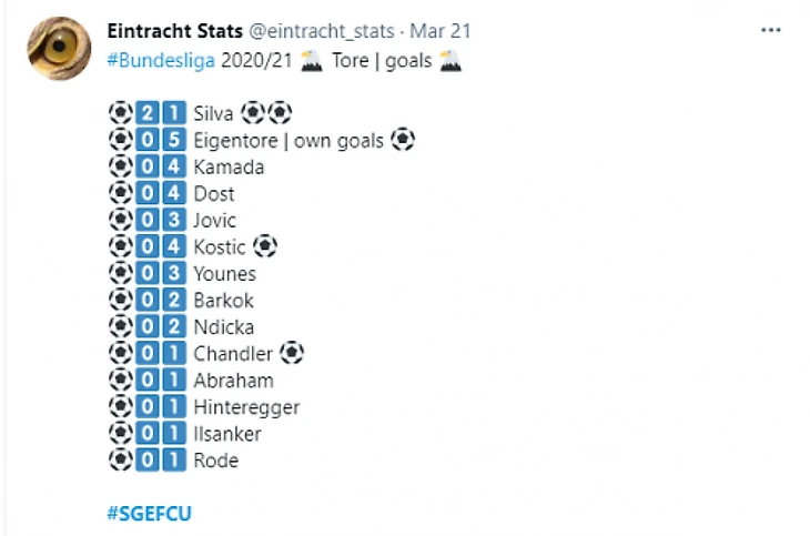 Андре Сильва забил 21-й гол в сезоне. Это уже второй рекордный показатель игрока «Айнтрахта» в Бундеслиге, только Бернд Хольценбейн чаще забивал в сезоне (26 раз в сезоне 1976-1977).
