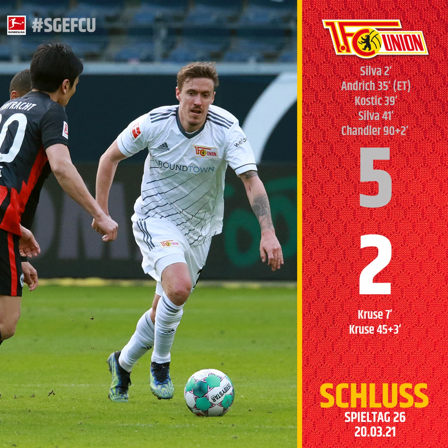 Макс Крузе в этом сезоне сделал два дубля за «Унион»: в обеих играх против «Айнтрахта». При этом Крузе забил самый маловероятный удар субботы 26-го игрового тура (значение xG = 0,042 или 4,2%).