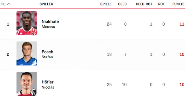 *игрок – кол-во игр – желтые – 1+1 желтые – красные – всего