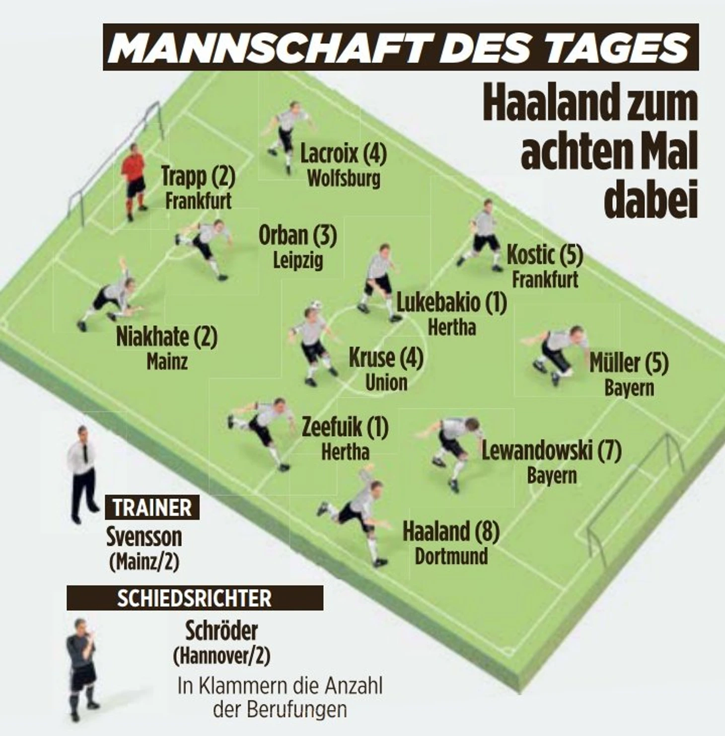 Холланд, забив свой второй дубль на третьем подряд выезде, повторил рекорд Бундеслиги Роберта Левандовски (2016/17), Герда Мюллера (1971/72) и Райнера Шенвальдера (1963/64). Норвежец является самым молодым игроком в истории Чемпионата с 34 голами – так он сместил рекордсмена Клауса Фишера.