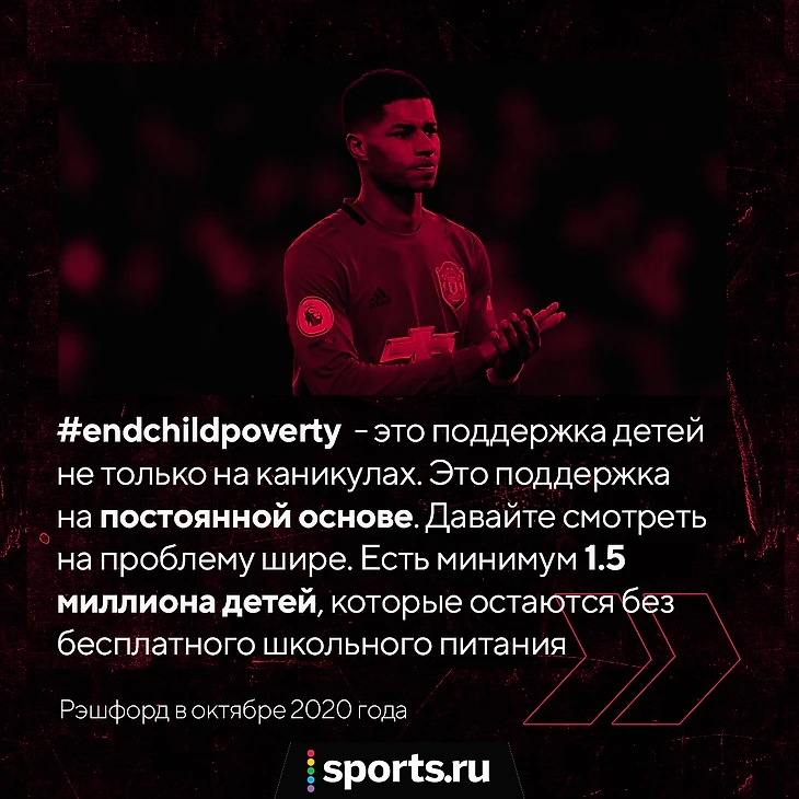 Борис Джонсон почти сразу позвонил Рэшфорду. «Я набрал Маркусу и признался, что только совсем недавно узнал об его кампании. Я очень благодарен за то, что он делает». Благодаря форварду «МЮ» соцпомощь с ваучерами продлили, и около 1,3 млн детей продолжили получать бесплатное питание. Маркус написал: «Даже не знаю, что сказать. Только посмотрите, чего мы можем достичь, когда мы вместе. Это Англия в 2020 году». После этого Рэшфорд еще не раз общался с Джонсоном и всегда по одному и тому же поводу – дети должны быть накормленными.