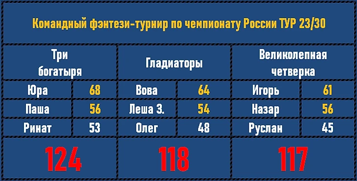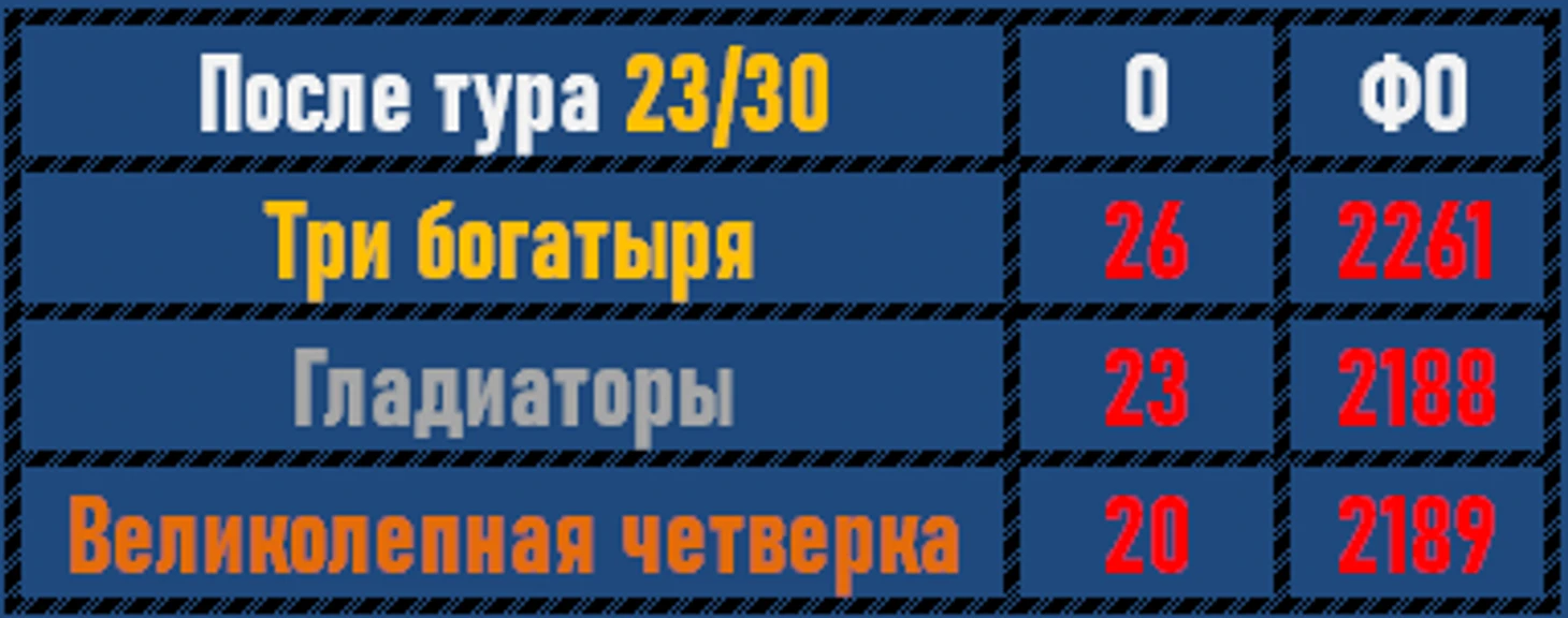 Три богатыря прерывают, наконец-таки, победную поступь бравых Гладиаторов! Последние, тем не менее, совсем чуточку отскочили от Великолепной четверки, но все же удержались на серебряной позиции в туре. Равная борьба в туре, где всё решил отличный результат Юры.
