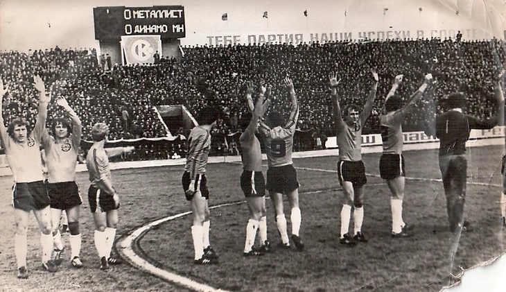 Слева - направо (в тёмном), игроки Металлиста: Владимир ЛИНКЕ - Станислав БЕРНИКОВ - Александр Горбик - Александр Косолапов... Ну а, крайний слева (рядом с В.Линке), защитник минского Динамо - игрок сборной СССР - С.Боровский.
