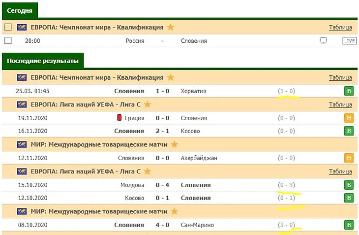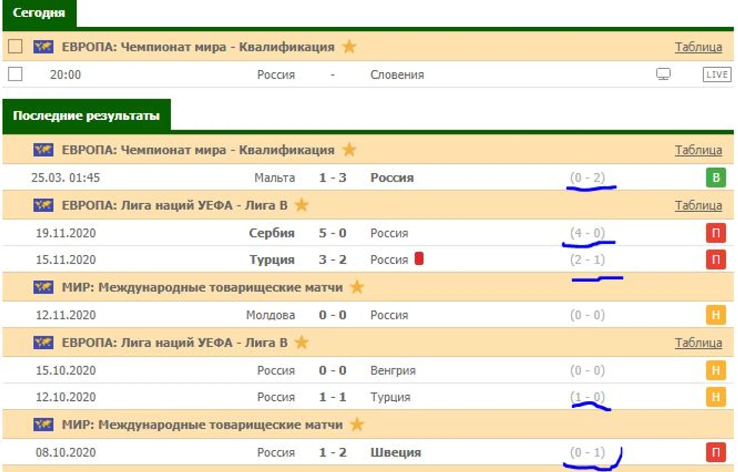 Снизу вы видите как играла сборная России последние семь матчей, а синим маркером выделены именно результаты первого тайма.