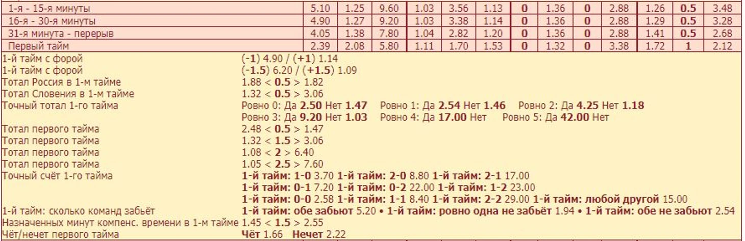 Предлагаем тут исходить от словенцев. Брать плюсовые форы на Словению, не стоит, коэффициенты слишком маленькие и игра попросту не стоит свеч. Проиграют ли словенцы первый тайм россиянам? Очень вряд - ли, и поэтому Х2 смотрится очень привлекательно за 1,53. По голам в тайме тоже не все понятно, можно взять ставку на то, что Россия не забьет, кэф 1,88. А можно обратить внимание на интересный исход с подстраховкой, это фора 0 на Словению за 3,38. Есть объективные сомнения, что сборная России сможет обыграть крепких словенцев в первом тайме, а это уже возврат, а возврат - не минус. Ну и можно обратить внимание на два точных счет, это 0:0 за 2,58 и 0:1 за 7,20.