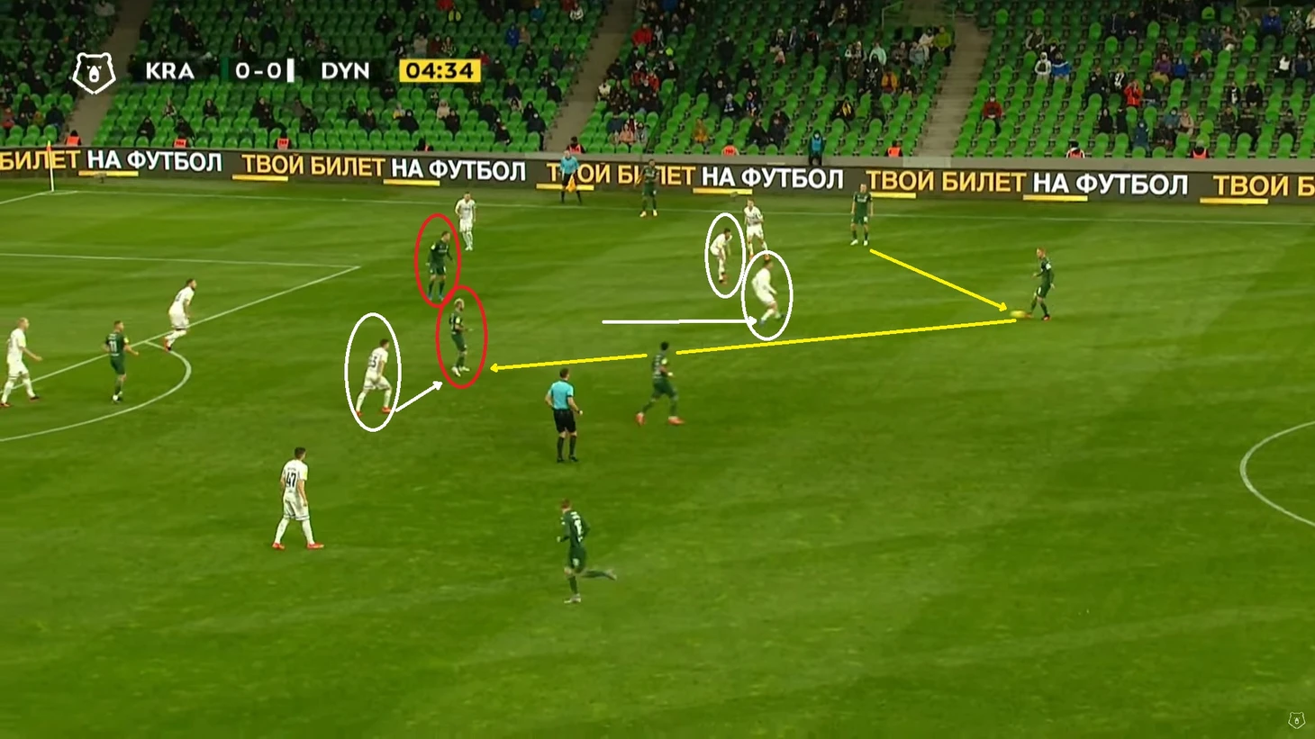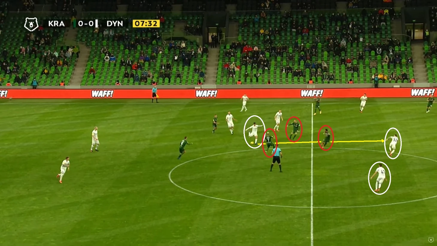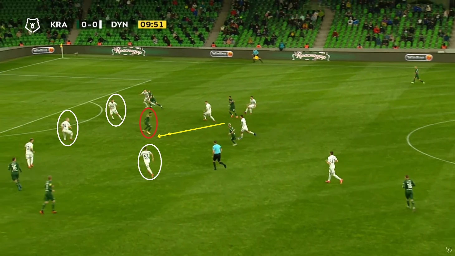 Динамо несмотря на высокий прессинг быстро возвращалось назад. На пятой минуте прекрасно виден пример важности подстраховки и общения на поле – без них игроки соперника легко открываются или остаются одни. Так на фото видно, как Моро выдвигается встречать своего игрока, но никто не занимает его позицию, что даёт возможность сопернику войти в нашу штрафную. А вообще, в данном случае ошибку совершил Лесовой, так как это он должен был выдвигаться на противника, а не Моро: