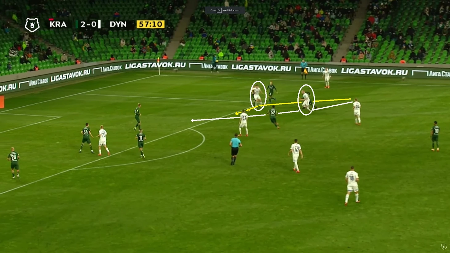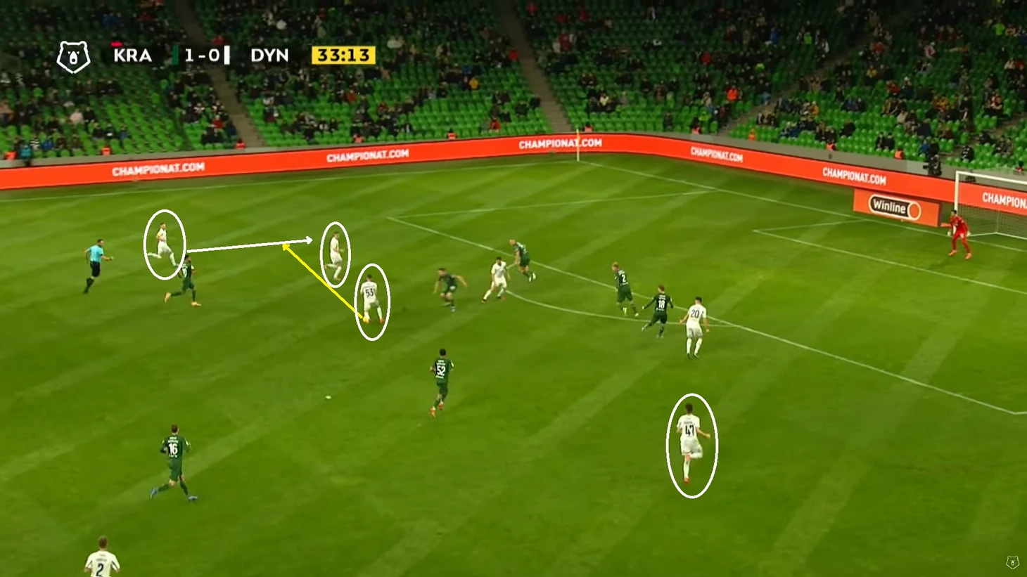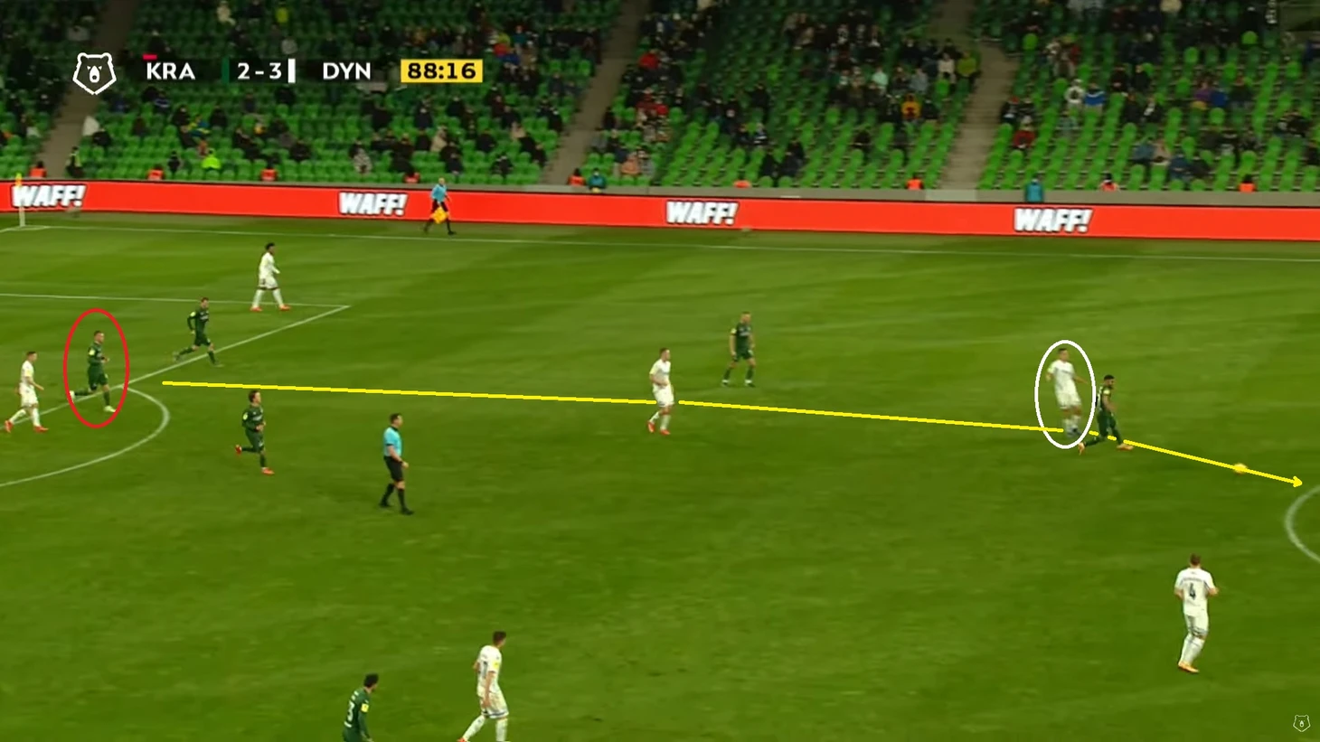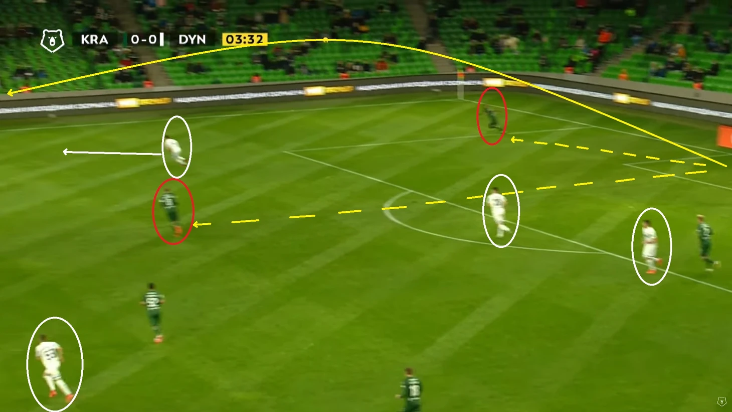 Динамо несмотря на высокий прессинг быстро возвращалось назад. На пятой минуте прекрасно виден пример важности подстраховки и общения на поле – без них игроки соперника легко открываются или остаются одни. Так на фото видно, как Моро выдвигается встречать своего игрока, но никто не занимает его позицию, что даёт возможность сопернику войти в нашу штрафную. А вообще, в данном случае ошибку совершил Лесовой, так как это он должен был выдвигаться на противника, а не Моро:
