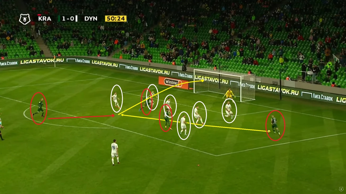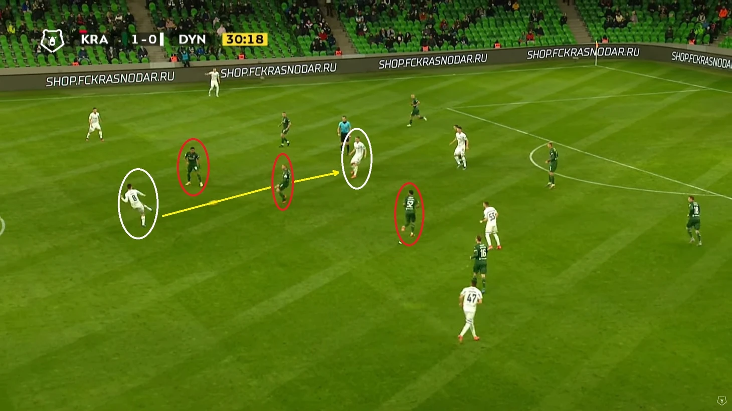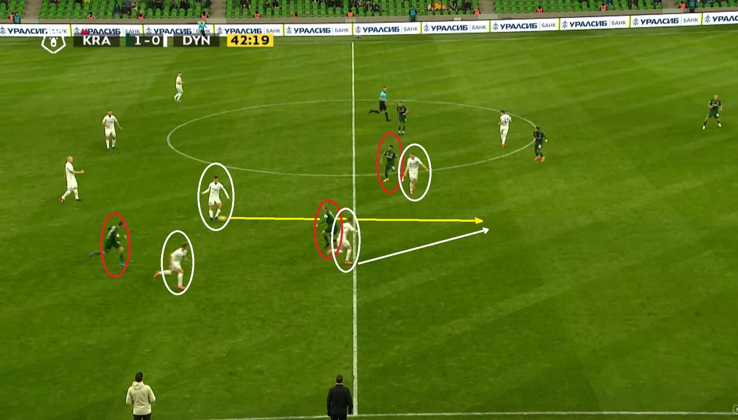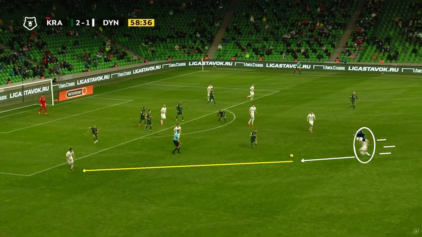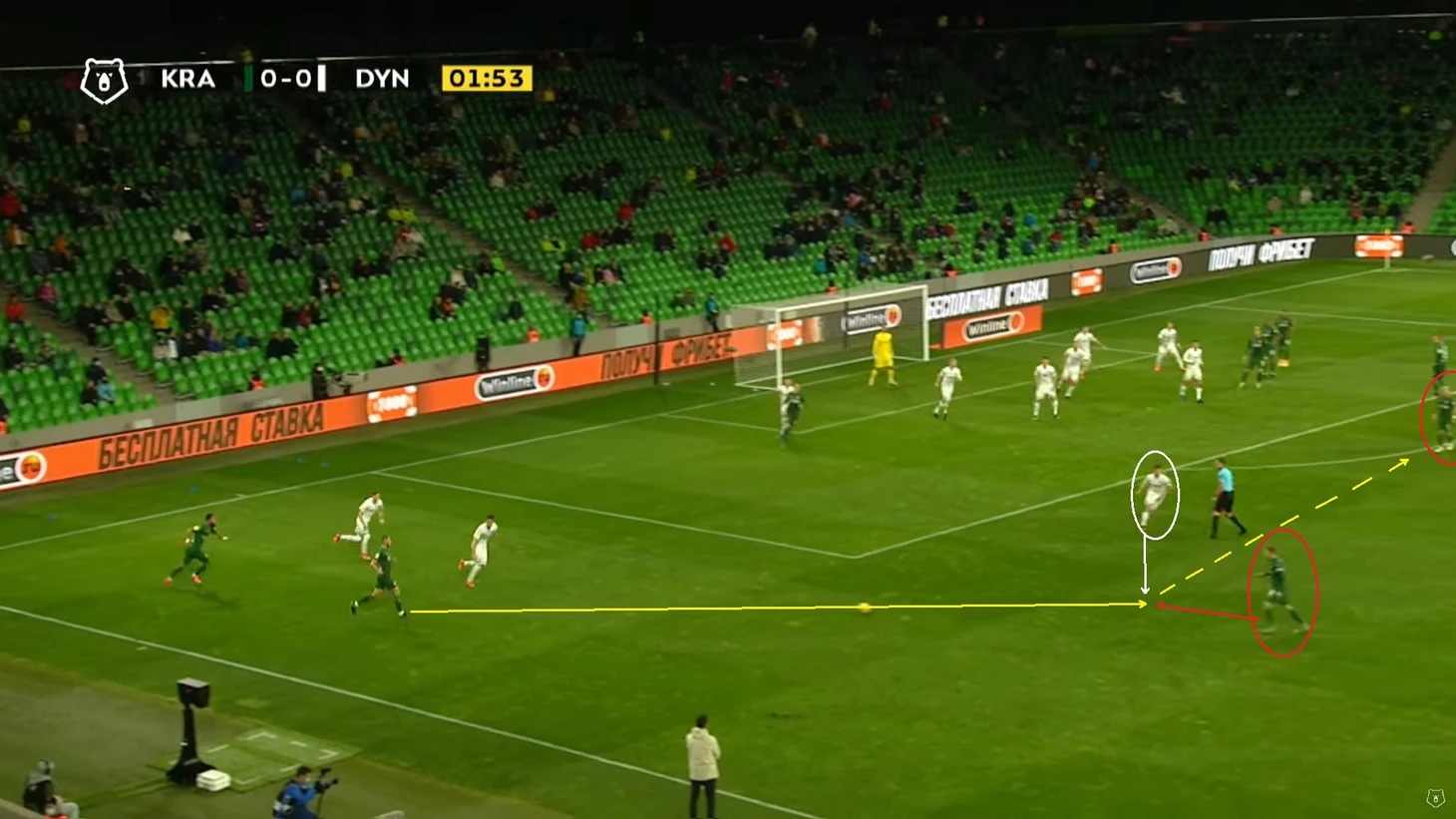 А вот и высокий прессинг Динамо, приведший к потере мяча Краснодаром из-за неправильного решения Бабурина выбить мяч, а ведь было ещё два предложения от своих игроков. К сожалению далее, в перспективной контратаке Шиманьски не увидел подключение Варелы справа и потерял мяч в окружении двух оппонентов.