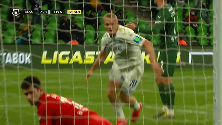 На 55 минуте Константин Тюкавин меняет слабо сыгравшего Скопинцева и Динамо начинает играть по схеме 3:5:2. И именно Константин попрессинговал защитника Краснодара, вынудив того просто выбить мяч в аут, тем самым подарив его нам для того, чтобы мы провели затяжную позиционную голевую атаку: Фомин забивает красивым обводящим ударом под не самые радостные эмоции комментатора, если сравнивать с голом Газинского. А на фото ниже я хочу отметить подключение в атаку Романа Евгеньева моментом ранее – Шварц бросает в нападение все силы, так как терять больше нечего: