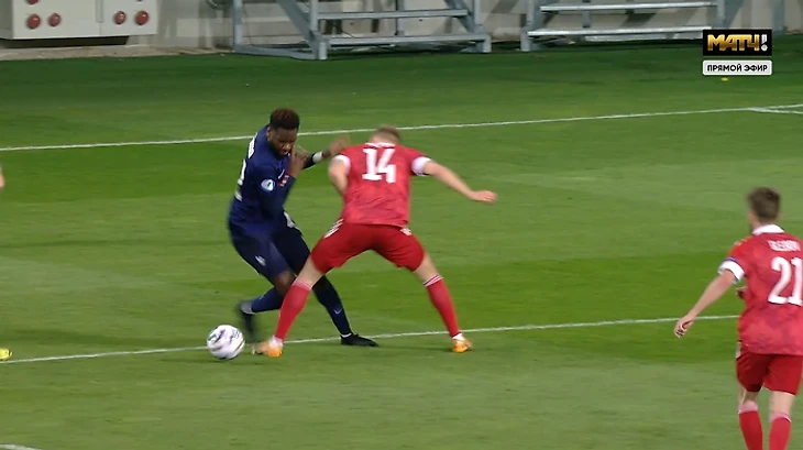 Самый острый момент России в матче все равно возник не после постепенного развития атаки – быстрый перевод на фланг Макарова привел к успешному дриблингу Дениса (в целом он у полузащитника «Рубина» не очень проходил) и передаче на Захаряна к линии штрафной. Второй раз за два матча дрогнул центр обороны Франции – Конате проспал движение Захаряна, а затем Арсен уложил на газон Кунде. Францию спас Лафон – вратарь вообще провел качественный матч, несколько раз подчищав за пределами штрафной после забросов России за спину.