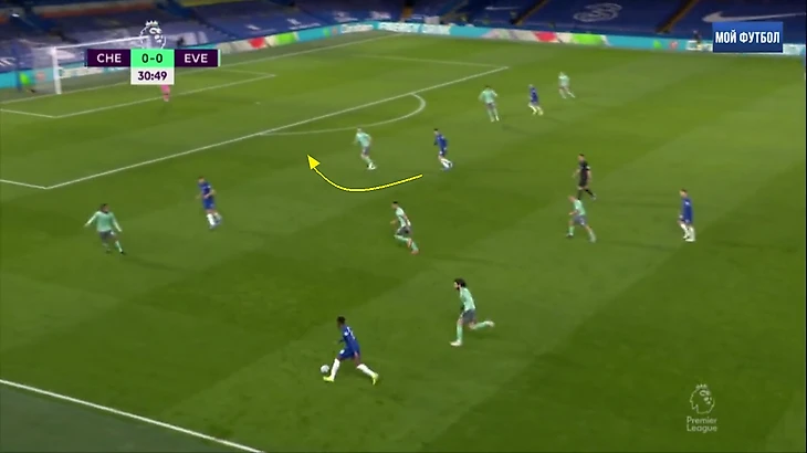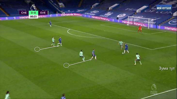 «Эвертон» высоко прессинговал «Челси» в таком активном темпе лишь первые две минуты. Если посмотреть другие матчи Эвертона, обычно их хватает на куда большее время: минут 10, не меньше. Одна из самых выносливых команд вообще перестала высоко прессинговать «синих» уже после первого тайма, что является очень крутым результатом.