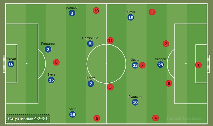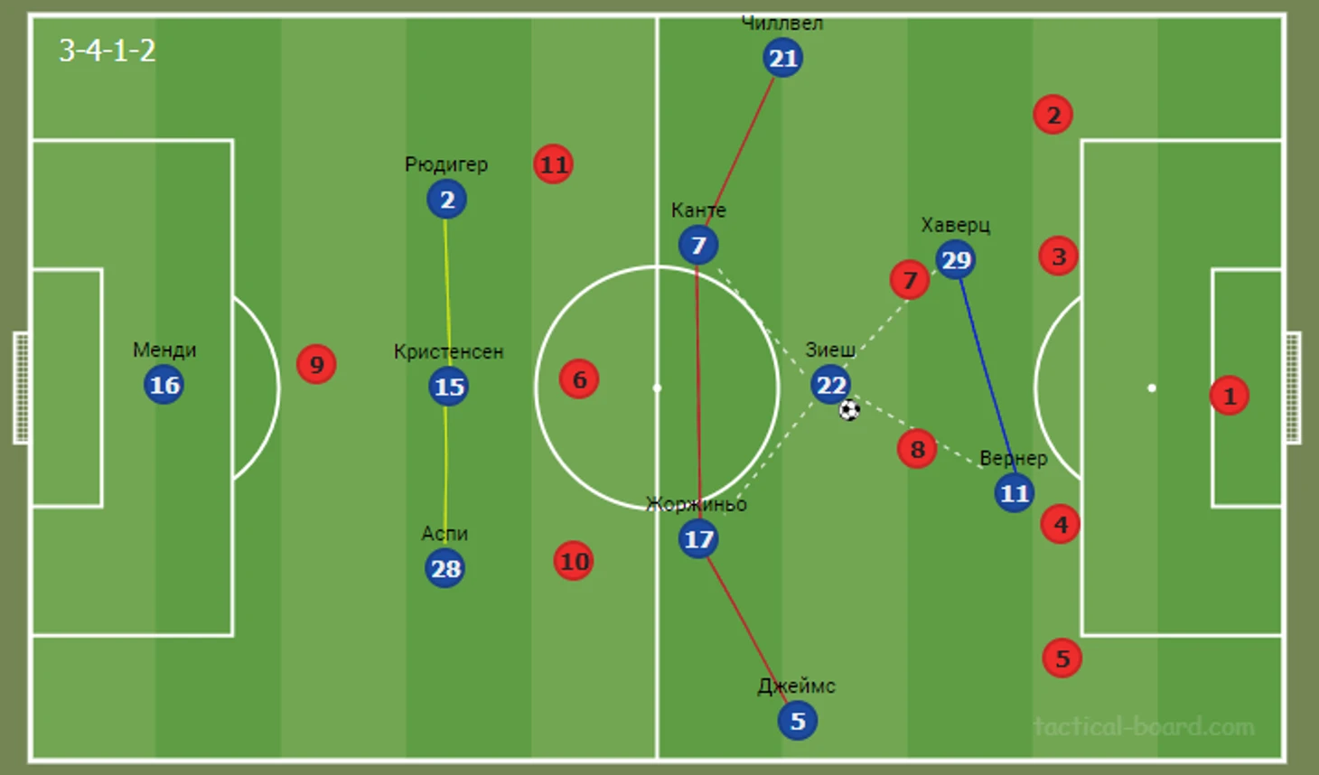 Которая при игре без мяча превращается в 4-4-1-1 с Зиешем в качестве координатора (при отсутствии эту роль может исполнить Маунт) и Хаверцом в качестве дополнительного бегунка: