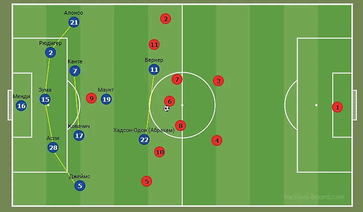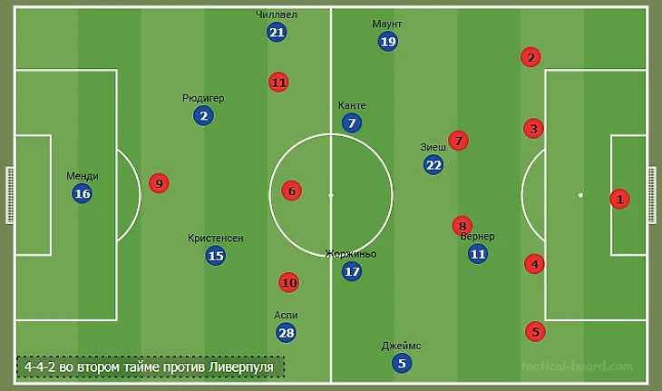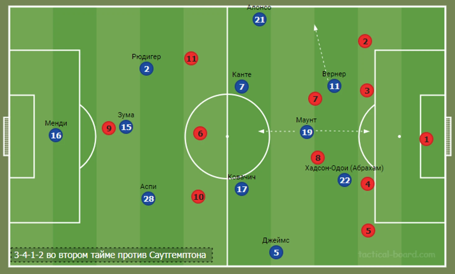 Тут команда перестроилась на, казалось бы, контратакующие 3-4-1-2. На самом деле, опять же, все зависит от игроков, играющих на поле. Будь в роль десятки не Маунт, а Зиеш, а форвардом был бы не Хадсон-Одои, а Абрахам, которого заменили в перерыве как раз Хадсона, то да, это бы была контратакующая модель.