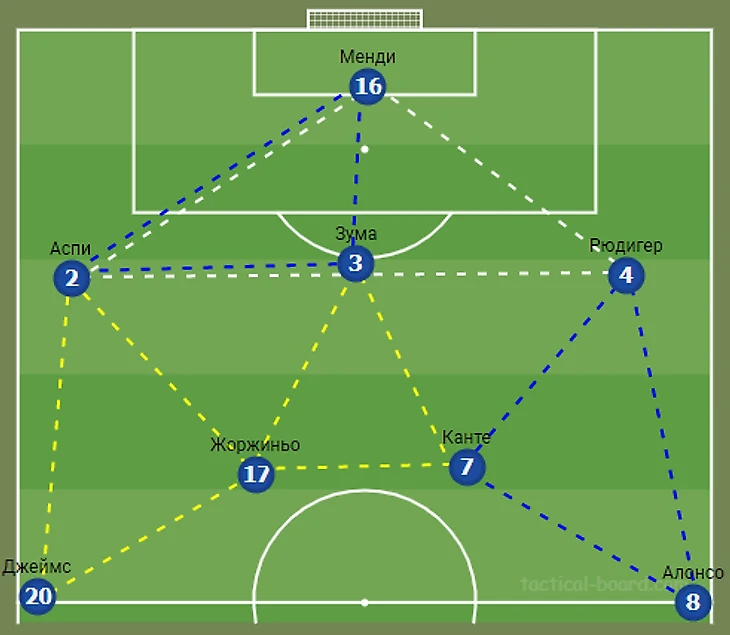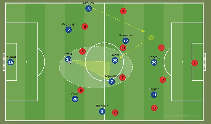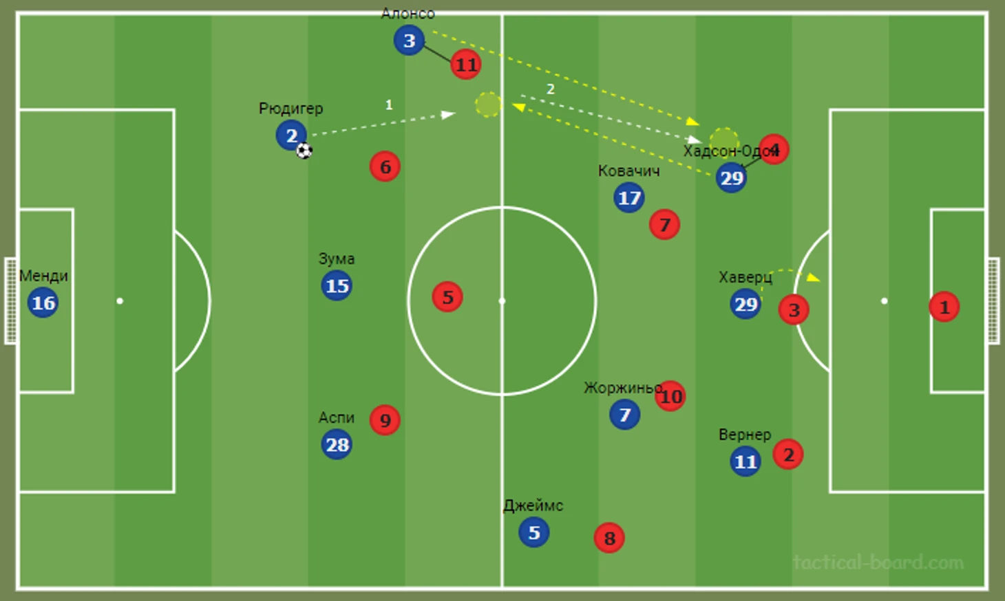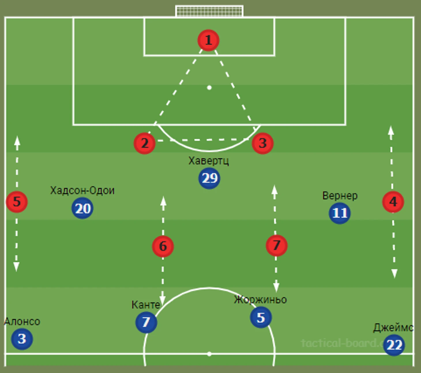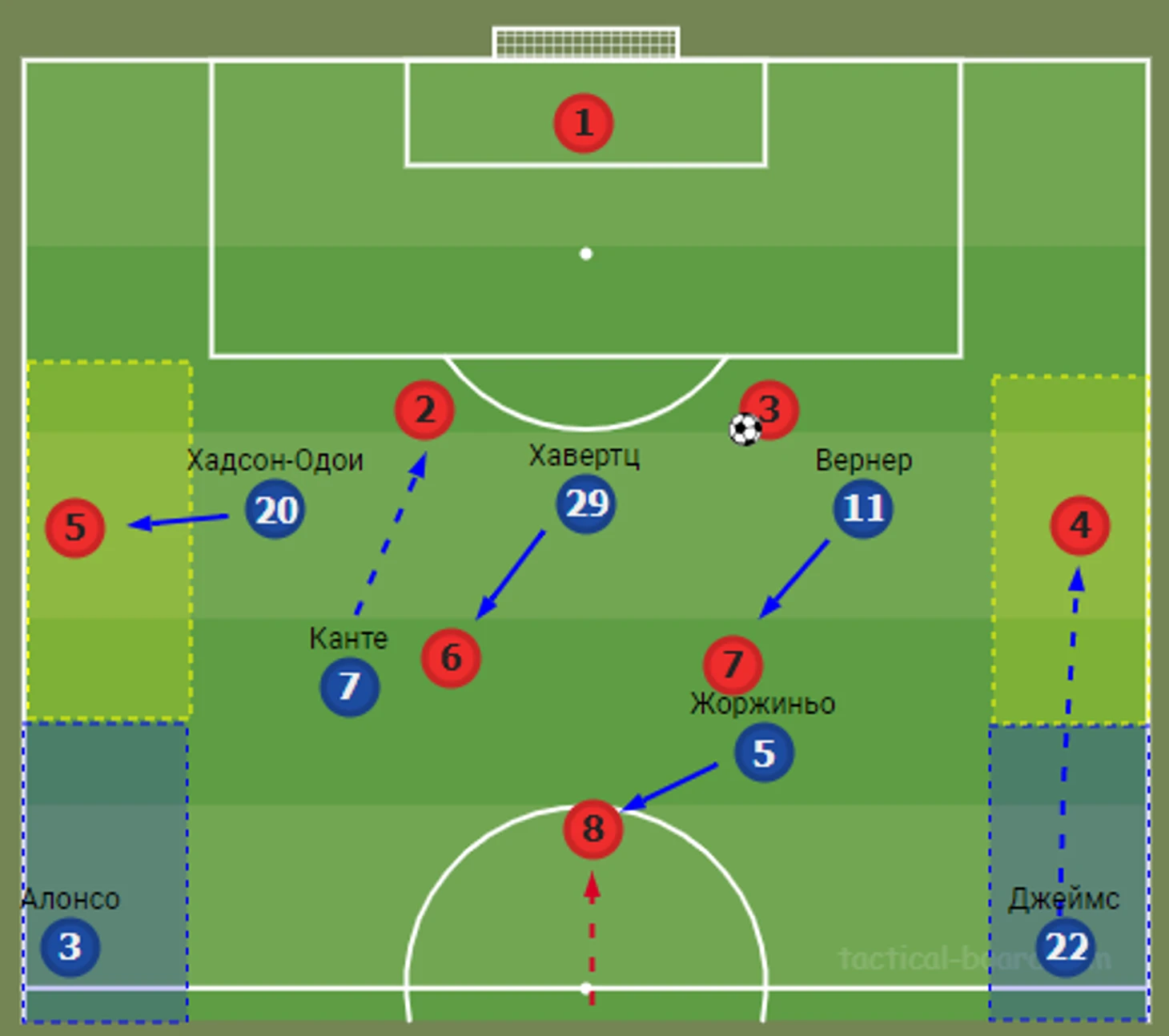 Отталкиваемся опять от того, в какой стороне мяч. Допустим у игрока под номером 3. Жоржиньо (условно) берет этого лишнего на себя, вингер на другом фланге перекрывает линию передачи на зищитника, Хавертц и Вернер делают то же самое против полузащитников, а Джеймс и Канте готовы прессинговать единтсвенных, кому третий номер имеет шанс дать пас.