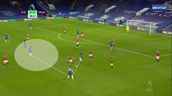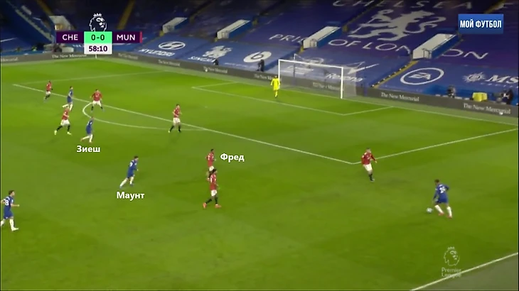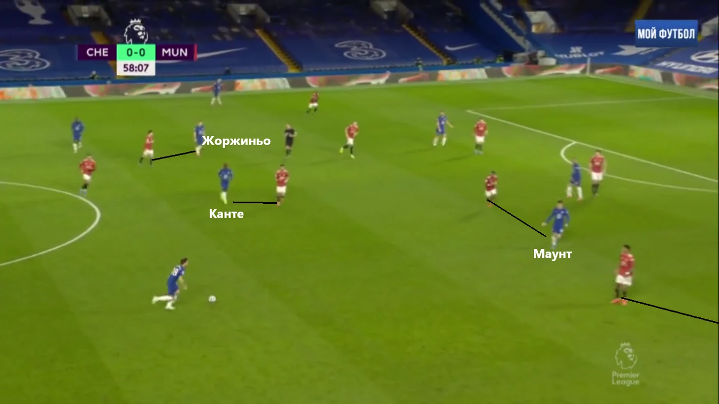 После розыгрыша через Джеймса Фред и Рэшфорд были буквально отыграны, а Маунт абсолютно свободен. Игрок на пару с поддерживающим защитником в роли Аспи абсолютно свободен, когда на острие Зиеш и Жиру, а на фланге Чиллвел. Атака легко могла развертнутся в голевой момент, логичным было выдвинутся на мяч.