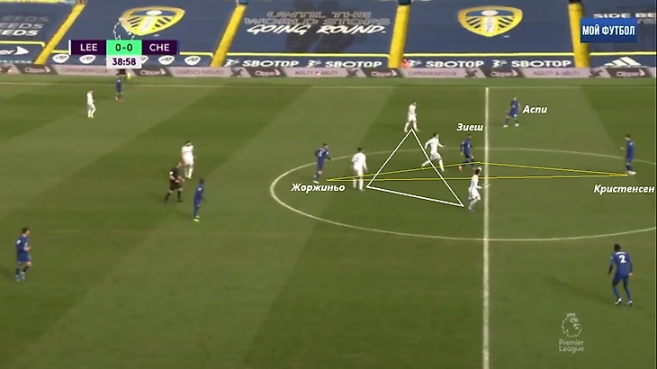 На этом скрине можно увидеть, как Зиеш, спустившись со своей позиции образует центральный треугольник вместе с центральным защитником и одним из опорников. Этим треугольником они пытаются вывести на индивидуальное продвижение мяча Кристенсена.