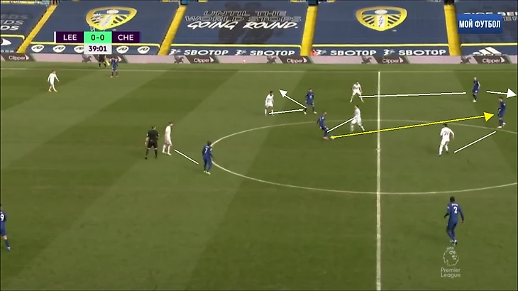Так же легко Тухель может использовать ситуативные схемы. Это когда схема нужна только в конкретный момент, но не иначе, как с 4-3-3, с которыми Челси играл на протяжении трех минут против Бернли, двух минут против МЮ, четырех против Ньюкасла и целый тайм против Лидса: