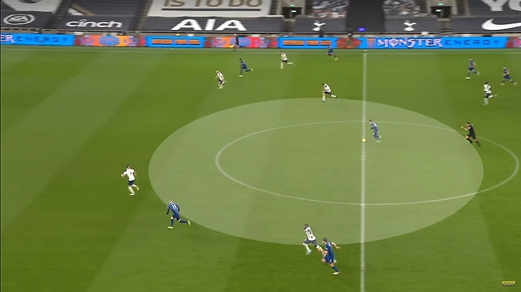 Что делает в этот момент Канте? Отводит лишнего игрока от верхнего блока, по скольку тогда Лидс будет в большинстве. За счет этого будет куда легче разрушить этот розыгрыш.