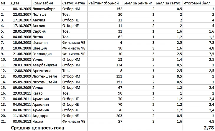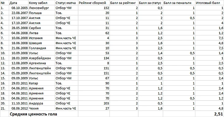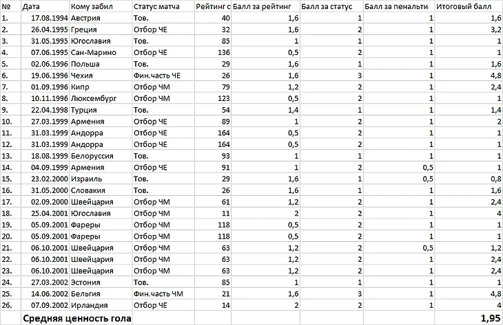 Павлюченко сыграл ровно полсотни матчей в футболке сборной, за которые забил немало – 21 гол (0,42 гола за матч, выше чем у Кержакова и Бесчастных). Давайте оценим их полезность (методология подсчета ценности голов описана в предыдущем посте, повторяться не буду https://www.sports.ru/football/blogs/2904015.html ):